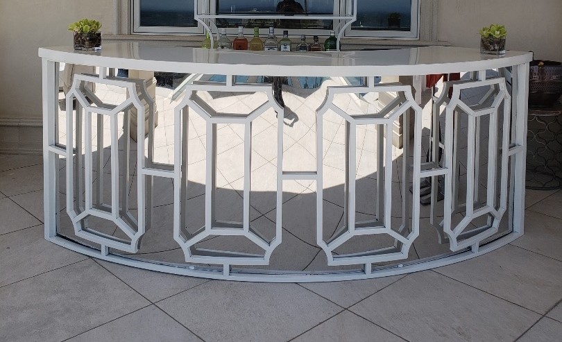 The Serpentine Luxe Bar features a gold or white frame design with a mirror back. Combine 2 to create a half circle to accommodate your guests. This bar will compliment the theme of your next lavish event.