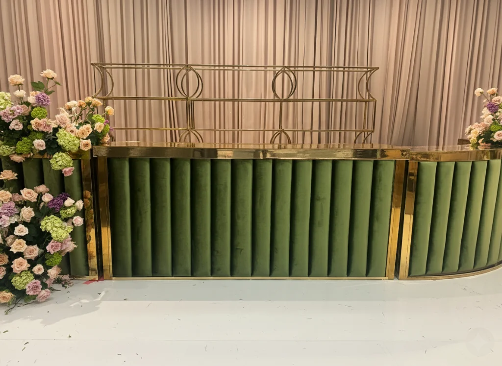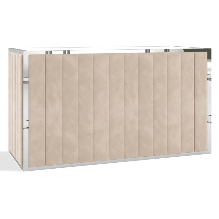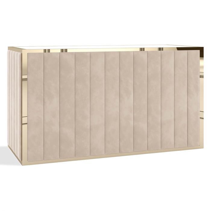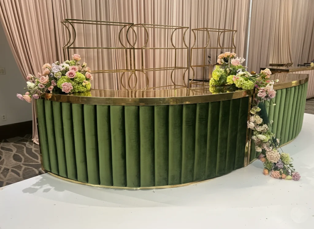 The Chloe Bar features a velvet channel design with a gold or chrome frame. The Chloe Bar is available in different styles, both straight and serpentine, perfect for any event. Its elevated design allows it to compliment the theme of your dream event. This bar will go well with majority of the gold colored furniture we offer.
