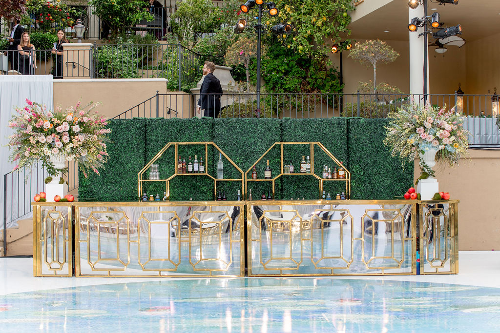 The Luxe Bar uses a gold frame and design with a mirror back. Featuring a symmetrical emerald style bar front, its posh design allows it to compliment the theme of your dream event. This bar will go well with majority of the gold colored furniture we offer.