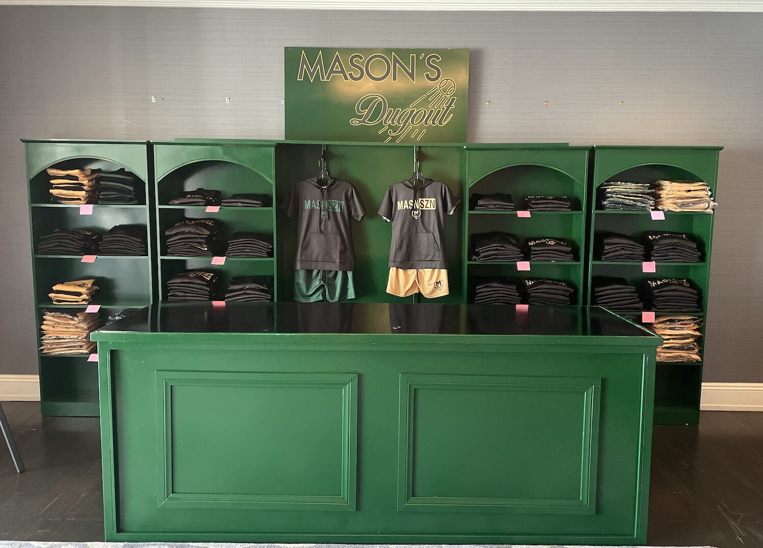 Our Merch Station provides a clean, modern setup to showcase your custom apparel and branded products. Perfect for Mitzvahs, birthday parties, corporate events, and more. It highlights items like shirts, hats, hoodies, and accessories on display.